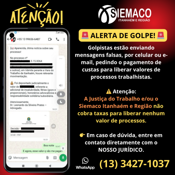 📢 NOTA OFICIAL – ALERTA DE GOLPE O Siemaco Itanhaém e Região alerta todos os trabalhadores e trabalhadoras sobre um golpe que vem sendo aplicado contra pessoas com processos na…